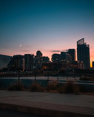 The city slows as the sky changes. Day releases its grip, night hasn’t fully arrived, and the buildings sit somewhere in between; lit from within, silhouetted from without. A thin moon hangs above, the road keeps moving below. Everything passes through this moment briefly, without asking it to last. Captured at dusk and printed on fine art paper to preserve color, depth, and atmosphere. A pause suspended between motion and rest.