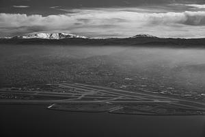 In this aerial perspective, the grayscale tones imbue the scene with a timeless elegance, accentuating the contours of the landscape and the interplay of light and shadow. The airport, a hub of activity and connectivity, serves as a focal point, while Mont Sanin's imposing presence adds depth and grandeur to the composition.